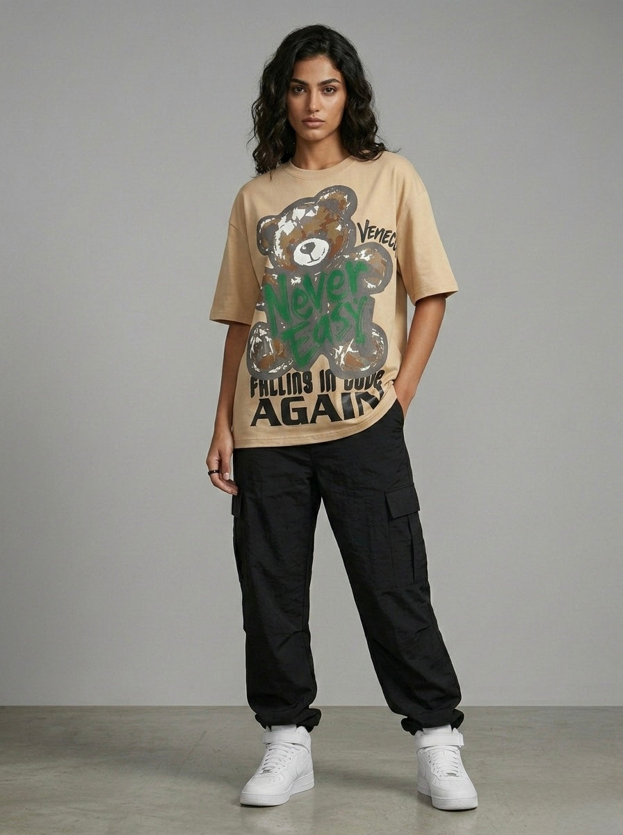 Experience the ultimate comfort and style with our Beige Teddy T-shirt! Made from 280 gsm cotton, this oversize, unisex shirt features a cute teddy graphic that adds a touch of fun to your wardrobe. Its beige color adds versatility to any outfit. Upgrade your fashion game and feel cozy all day long!