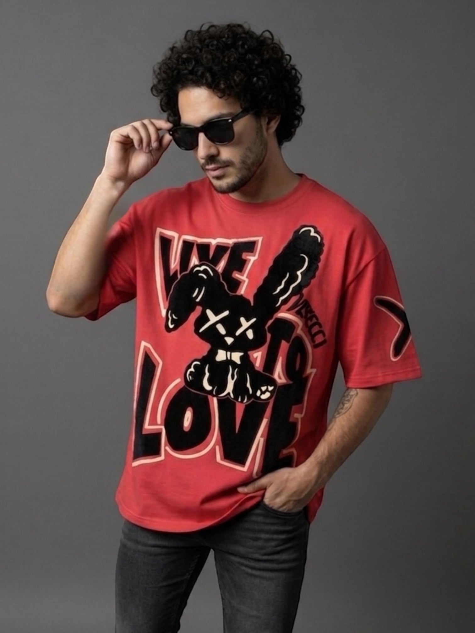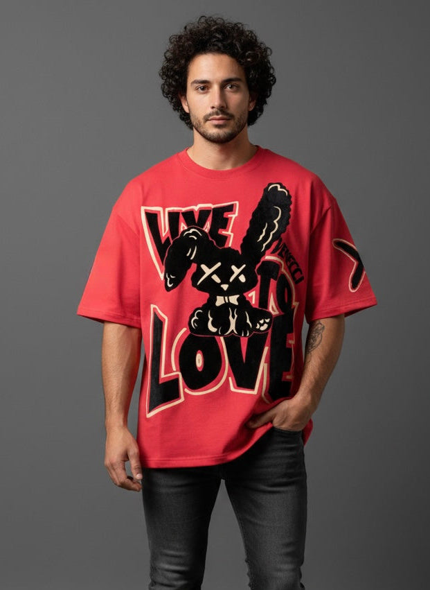 Feel the love with our Red Love T-shirt! Made from 280 gsm cotton, this unisex shirt features an oversize fit for maximum comfort. Featuring a bold "Live to Love" graphic, this shirt is perfect for spreading love and positivity wherever you go.