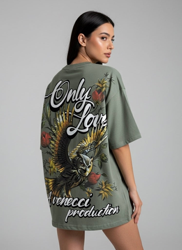 Love nature and fashion? This sage green owl t-shirt is the perfect blend of both! Made with 260 gsm cotton for a soft and durable feel, the oversize fit is both comfortable and trendy. The intricate owl and floral elements beautifully complement the "only love" text, making this tee a must-have for any nature lover's wardrobe.