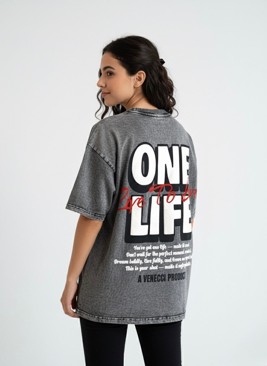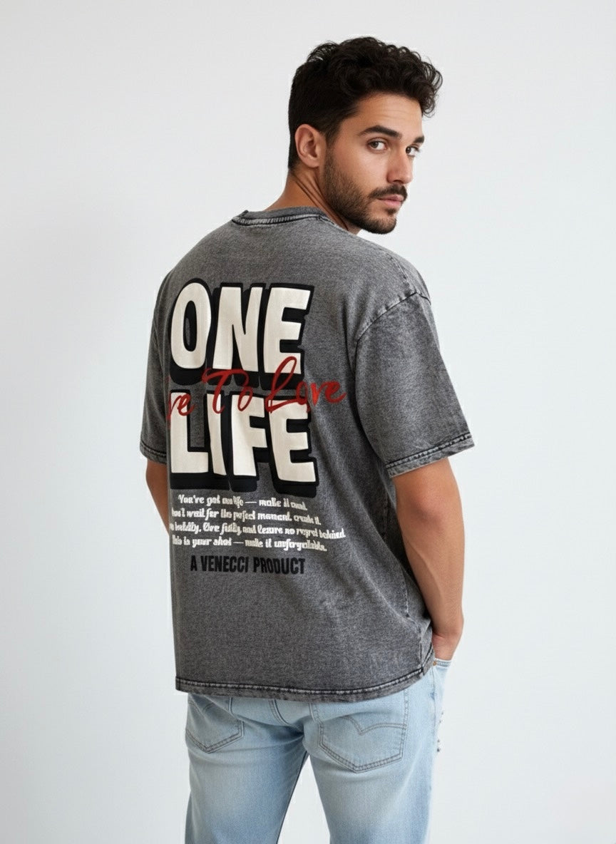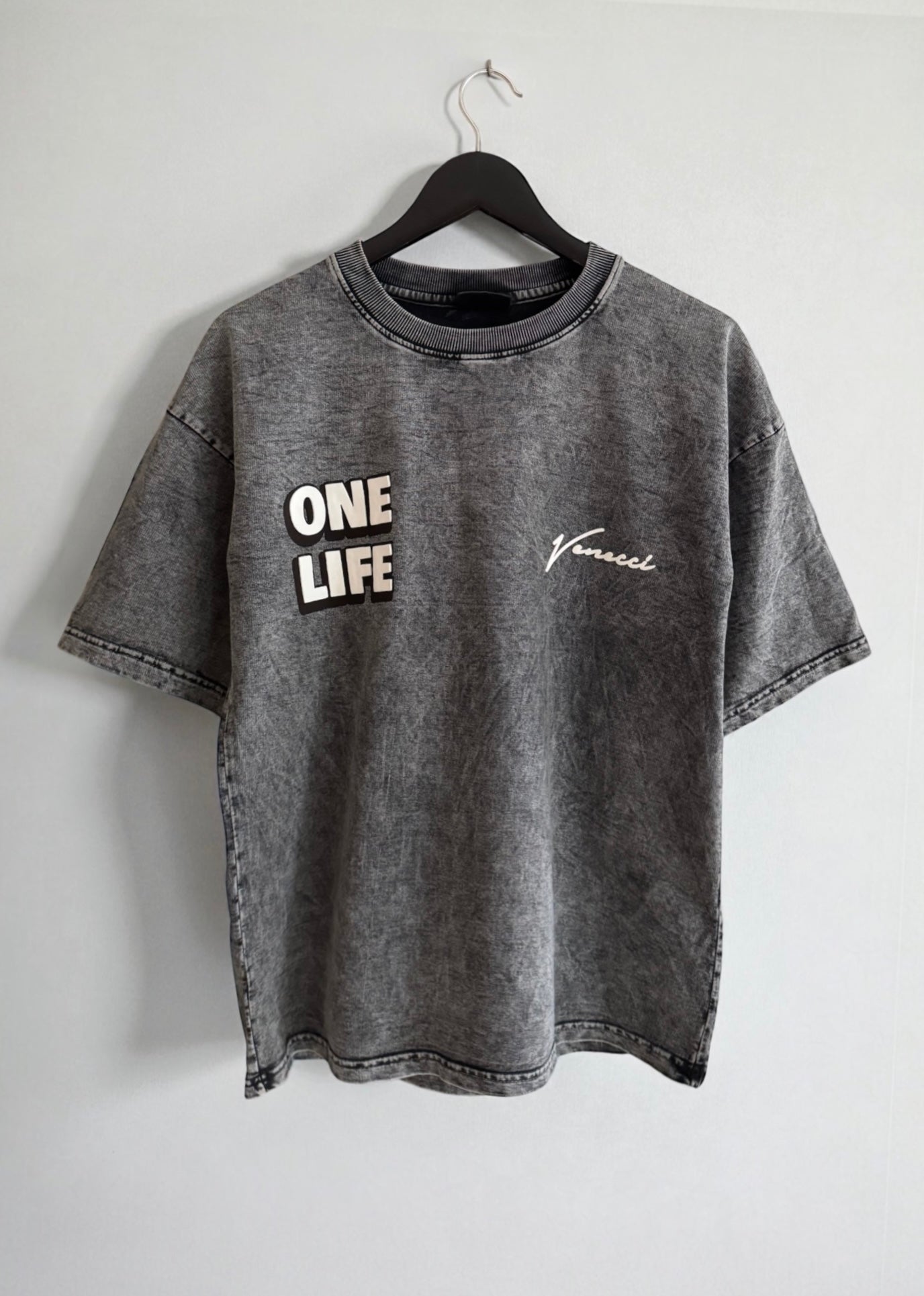 Experience the bold style and comfort of our Acid Grey Life T-Shirt. Made with high-quality 260 gsm cotton, this oversized unisex t-shirt features a unique acid wash design and a powerful "One Life" quote. Embrace your individuality and make a statement with this must-have shirt.